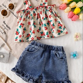 SHEIN Baby girl Cute Summer Vacation Ruffle Strap Top A...