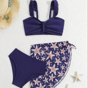 Young Girl Solid Bikini Set With Starfish Print Cover-U...