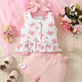 SHEIN Baby Bear Print Ruffle Hem Tank Top & Shorts & Ac...