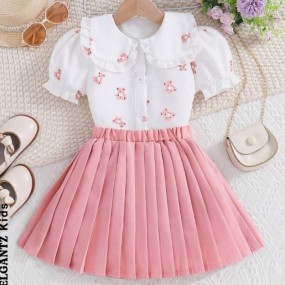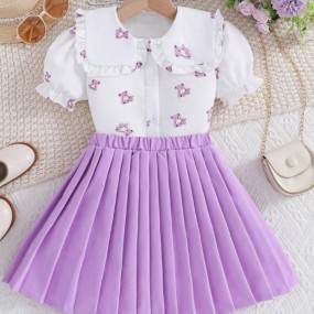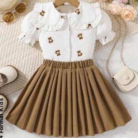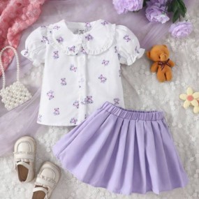 Baby Girl Bear Printed Doll Collar Short Sleeve Top And...