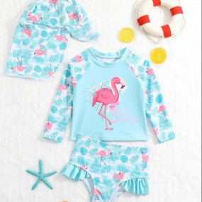 Baby Girl Flamingo Print Ruffle Trim Swimsuit With Hat