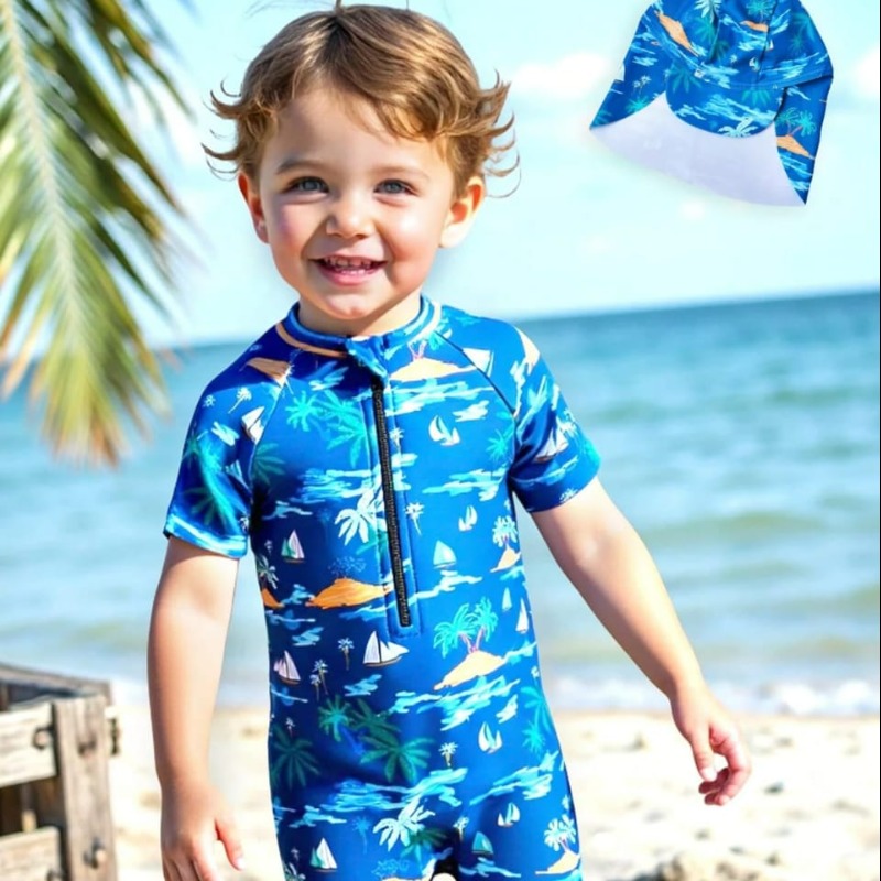 2pcs Set Cute Toddler Boys' Tropical Coconut Tree Vacation Swimsuit, Zip Front, With Sun Protection Hat, Blue Tie Dye Short Sleeve One Piece Swimwear